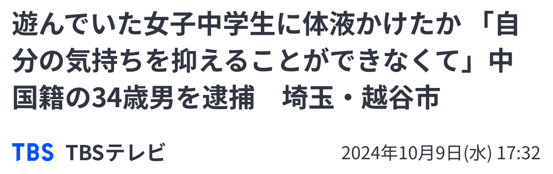 35歲的中國男子李春贛被捕,他在埼玉縣越谷市的某商業場所中,從後方悄悄接近兩位日本女中學生,隨即將「體液」噴到了她們身上