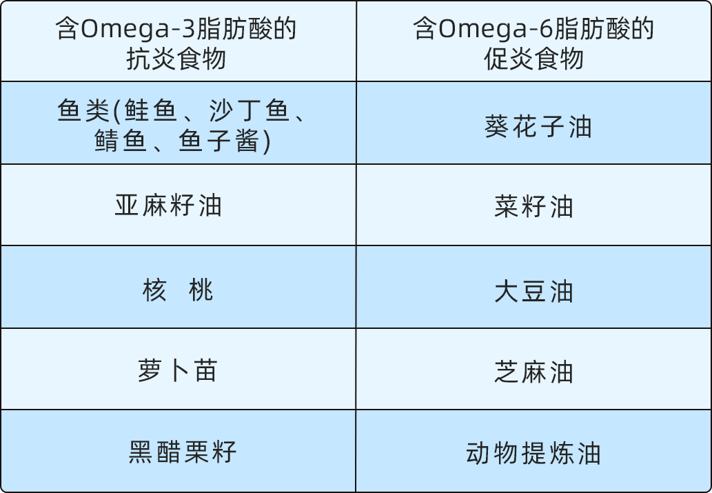 Omega-3脂肪酸是抗炎物质,而Omega-6脂肪酸则是促炎物质。
