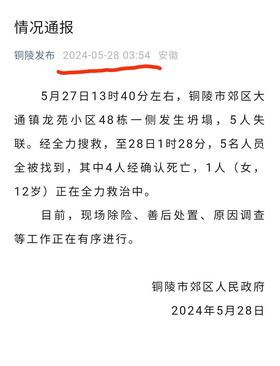据安徽铜陵市郊区人民政府:5月27日13时40分左右,铜陵市郊区大通镇龙苑小区48栋一侧发生坍塌,5人失联。经全力搜救,截至28日1时28分,5名失联人员全被找到,其中4人经确认死亡,1人(女,12岁)正在全力救治中。 https://t.co/YPCGjYWLnV