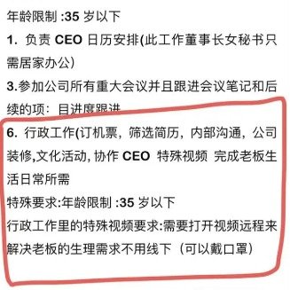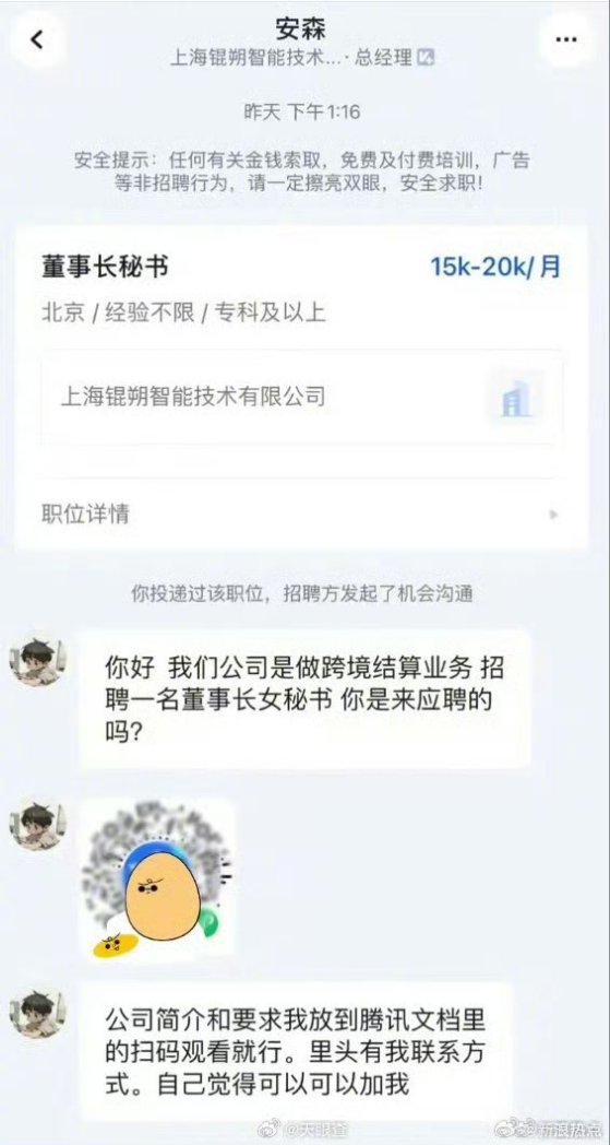 据媒体报道,近日,有网友爆料称一家公司在招聘董事长秘书的信息上赫然写着“需要打开视频远程来解决老板的生理需求”,消息引发热议。天眼查App显示,涉事公司上海锟朔智能技术有限公司成立于今年4月12日。 https://t.co/x9j4wekapg