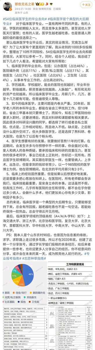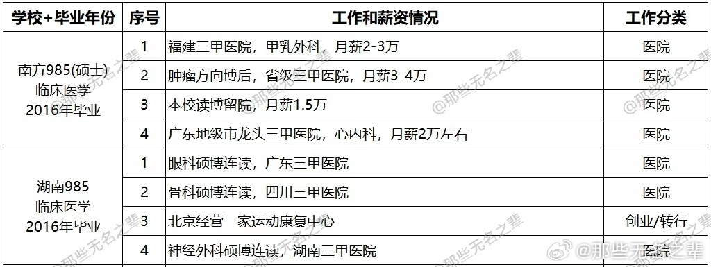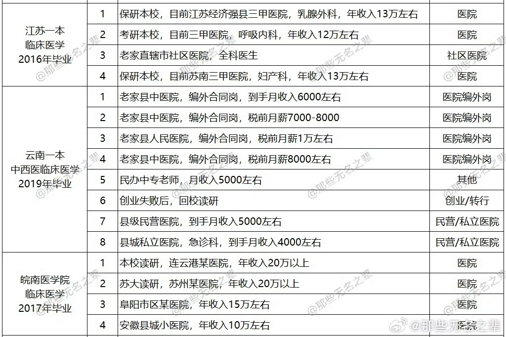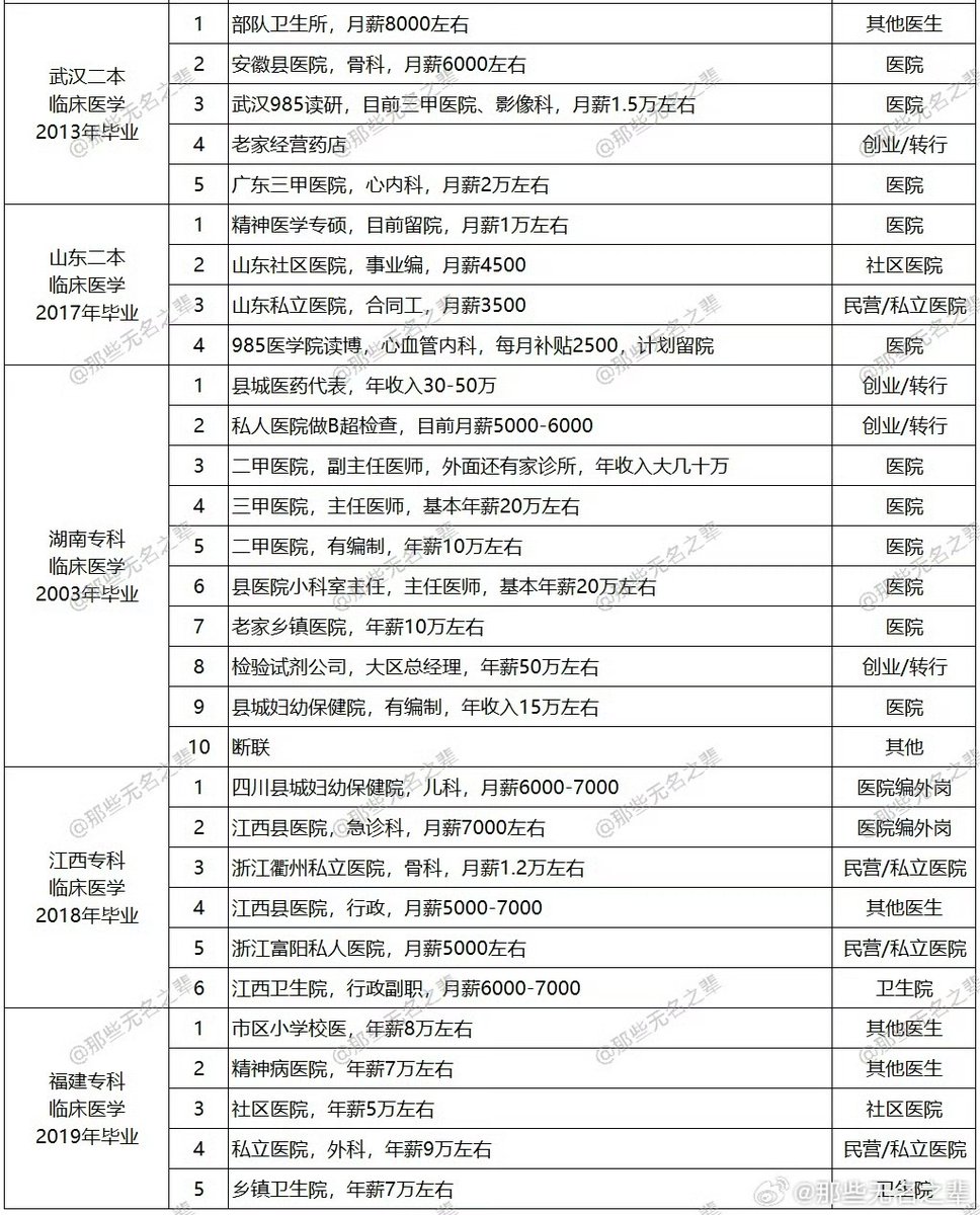 博主@那些无名之辈 整理出了10所不同院校、54位临床医学生的毕业去向和薪资情况,并表示:临床医学是一个典型的大后期专业,只要能够坚持下来,总会有所回报,越老越吃香也不是一句空话,若能始终保持一腔热血,总会守得云开见月明。 https://t.co/83ECRsC51F