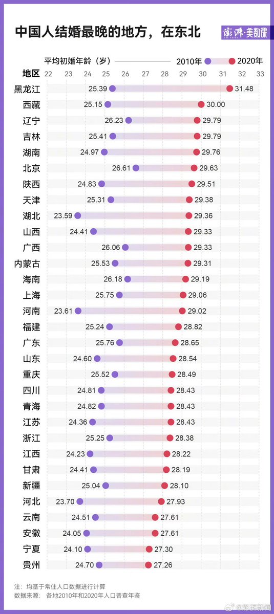 在多数人的认知里,北京、上海等经济越发达的地区似乎越晚结婚。然而东北三省的初婚年龄却要晚于北京、上海。