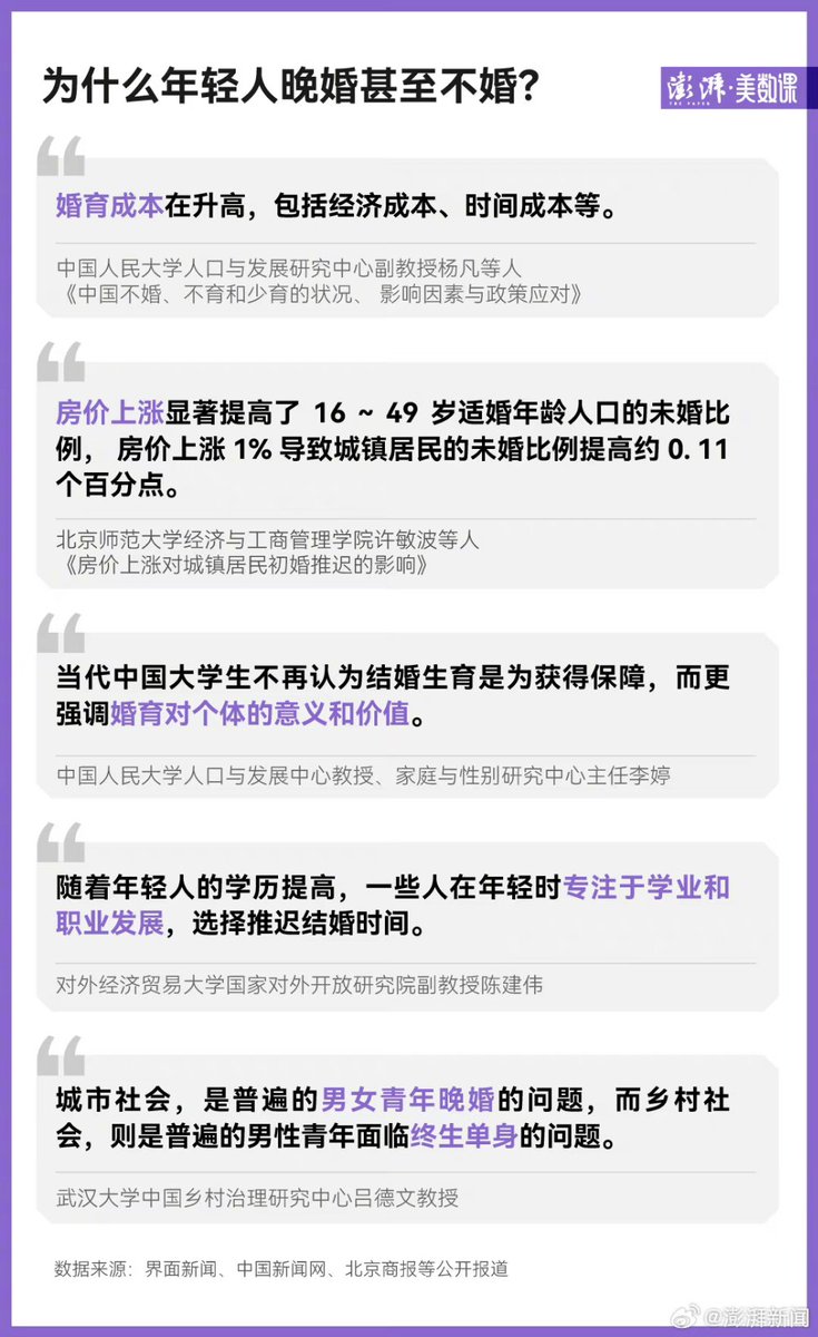 大龄不婚的情况与多重因素有关,包括适婚年龄人口的减少和性别比失衡等。中国人口学会副会长、南开大学经济学院教授原新在接受媒体采访时就提到,1980 年代到现在的出生人口性别比偏高 40 多年,直接后果就是目前 45 岁以下中国人口男性比女性累计多出生了 3400-3500 万,因为这种性别比先天性的失衡,有一部分人可能很难结婚。