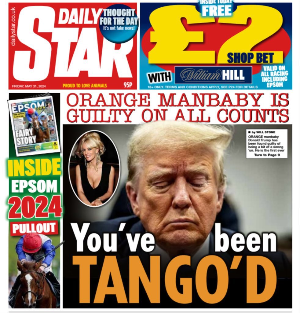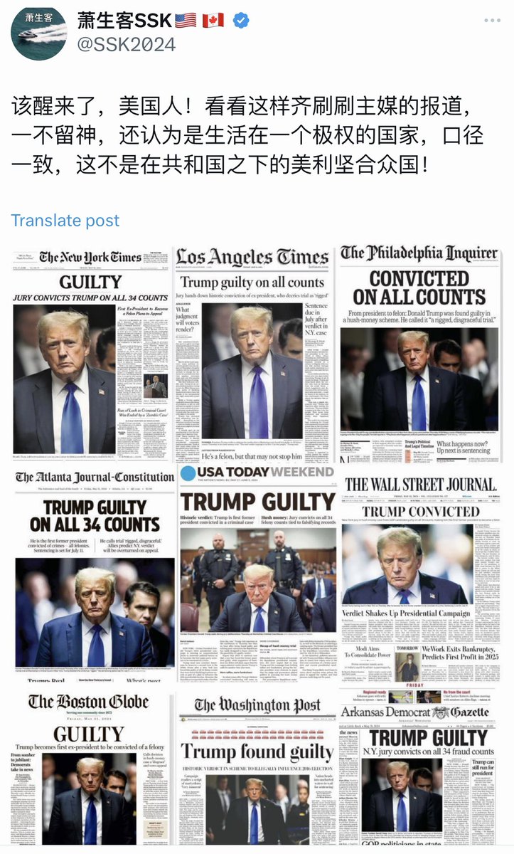 这个川粉的智商满70了吗?对美国前总统被定罪这么重大的新闻,他想要媒体低调报道?或者报道“无罪”?岂止美国媒体,国外媒体也大都头版头条报道川普有罪(中国官媒例外,头版头条一定是习主席),甚至连法轮功的媒体也很不情愿地用小篇幅头版头条报道,川粉是不是要说全世界媒体都被控制了? https://t.co/0zmCs3xvuE
