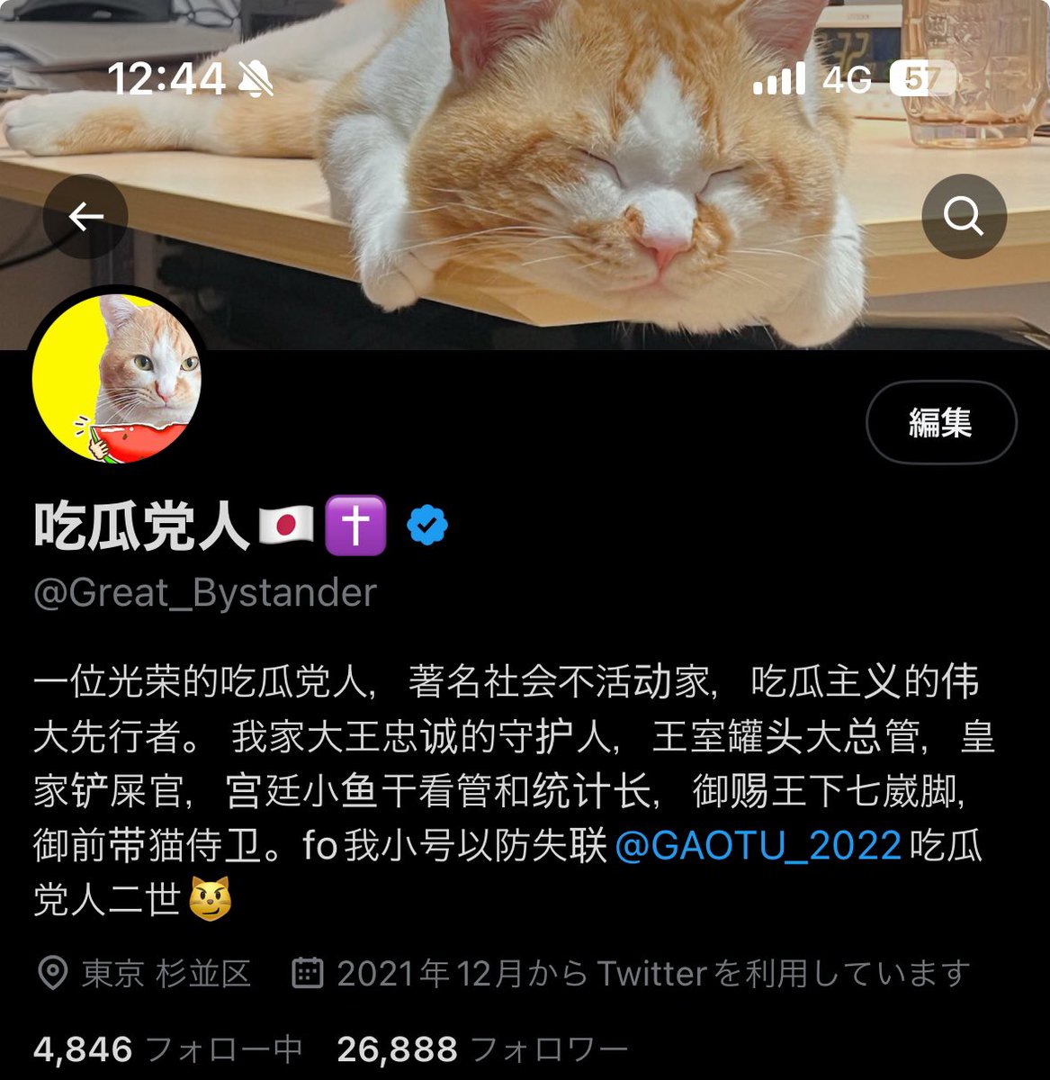 一位光荣的吃瓜党人,著名社会不活动家,吃瓜主义的伟大先行者。 我家大王忠诚的守护人,王室罐头大总管,皇家铲屎官,宫廷小鱼干看管和统计长,御赐王下七崴脚,御前带猫侍卫。fo我小号以防失联@GAOTU_2022吃瓜党人二世😼