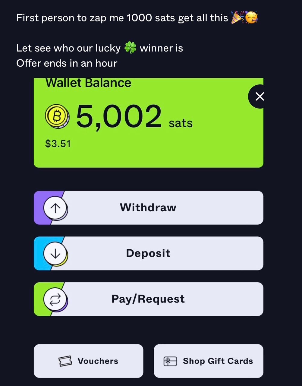 Send 500sats to get 1000