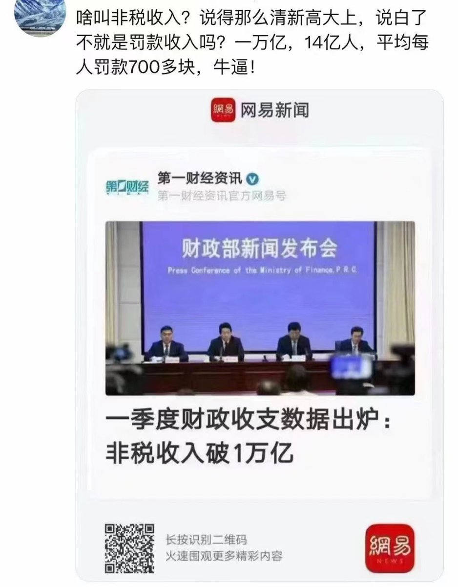 一季度罚款为主的非税收入破万亿,占财政总收入的近20%,全球之冠 https://t.co/FdVZqZwJw4