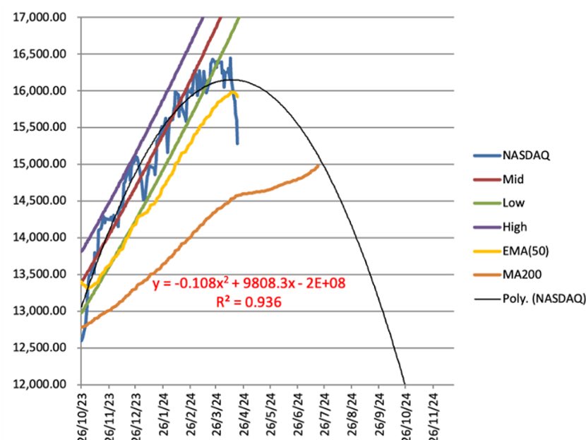 现在,美股唯一的龙头英伟达NVDA,也显颓势,虽然仍然顽强的凸性上涨,但涨势已经低于指数路径,有跌破指数上涨路径下限的可能。而“七姐妹”的其他成员,大多已经溃不成军,无法担当重任。