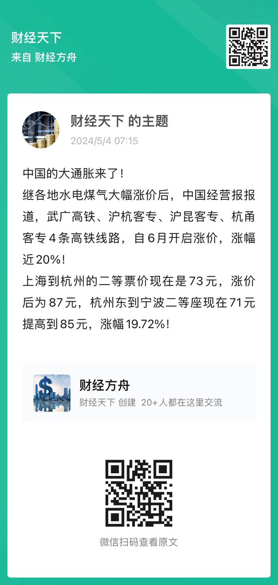 继各地水电煤气大幅涨价后,中国经营报报道,武广高铁、沪杭客专、沪昆客专、杭甬客专4条高铁线路,自6月开启涨价,涨幅近20%!