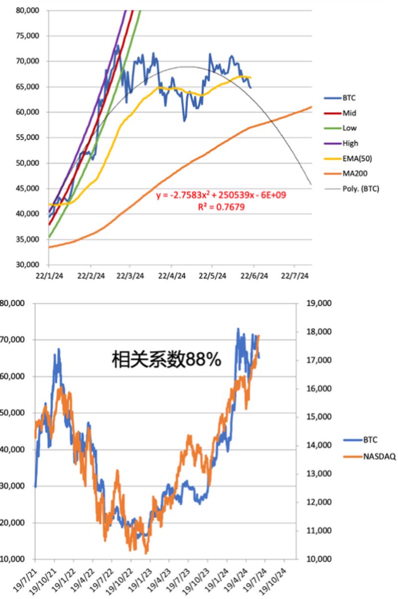 现在,比特币已经横盘4个月,处于凹性下跌状态。这对所有风险资产都是一个警示。历史上,纳斯达克指数和比特币的相关系数高达88%,同进同退。但是,最近一段时间,纳斯达克指数却在英伟达的带领下,不管不顾,抛开了比特币。这么高的相关系数,并不是因为比特币决定纳斯达克,也不是纳斯达克决定比特币,而是金融条件和风险偏好等一系列因素,同时作用于两种资产,效果类似,让这两种资产产生了相关性。