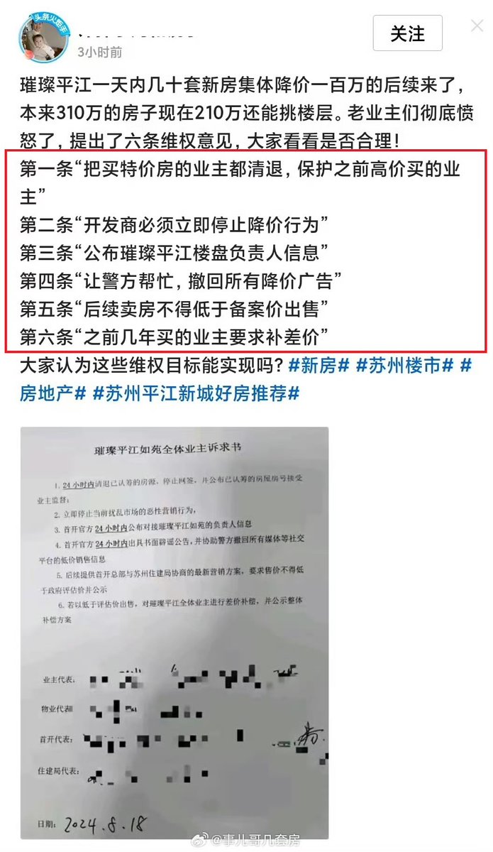 近日,江苏苏州。璀璨平江小区因降价引发老业主集体不满,并要求开发商在24小时内清退已认筹的房源,停止恶意营销行为、撤回所有社交媒体低价销售信息、若以低于评估价出售,需要对全体业主进行差价补偿。