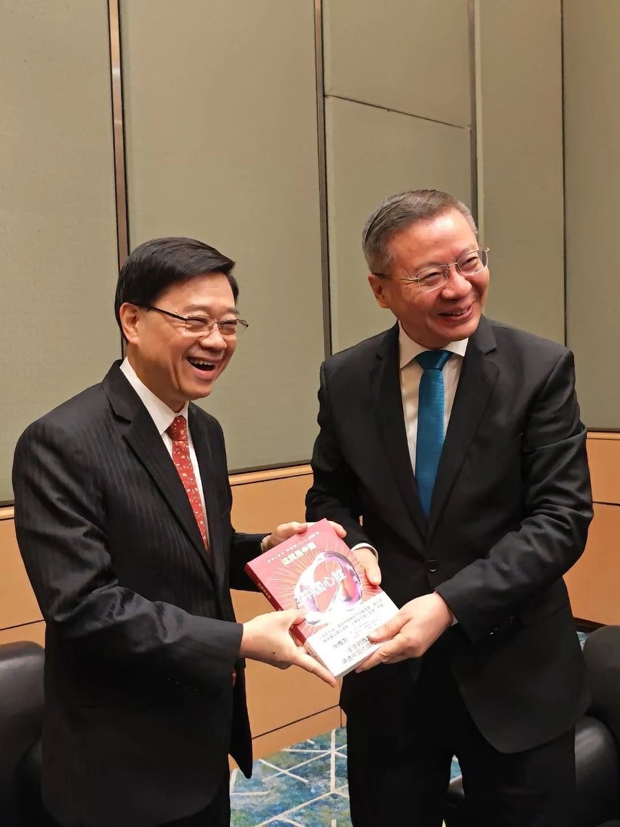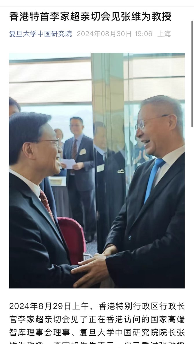 8月29日上午,香港特别行政区行政长官李家超会见了正在香港访问的张维为教授。双方就全面落实“一国两制”等问题交换了意见和看法,会议结束后,张维为向李家超赠送了自己的著作《这就是中国:中国必胜》