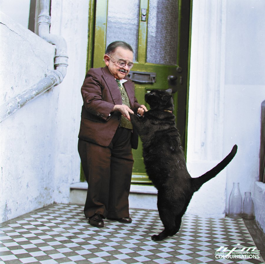 世界上最矮小的男人,1956 年在沃辛的家门口与他的宠物猫一起跳舞。 https://t.co/DjM0jthyBm