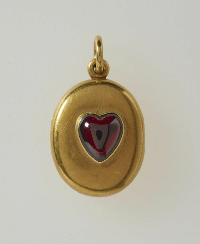 如此精致的盒形吊坠。椭圆形金质小盒,镶有一颗红色凸圆形心形宝石。维多利亚女王在奥斯本宫时将这枚小盒赠予特克郡主玛丽 (1867-1953) 年。