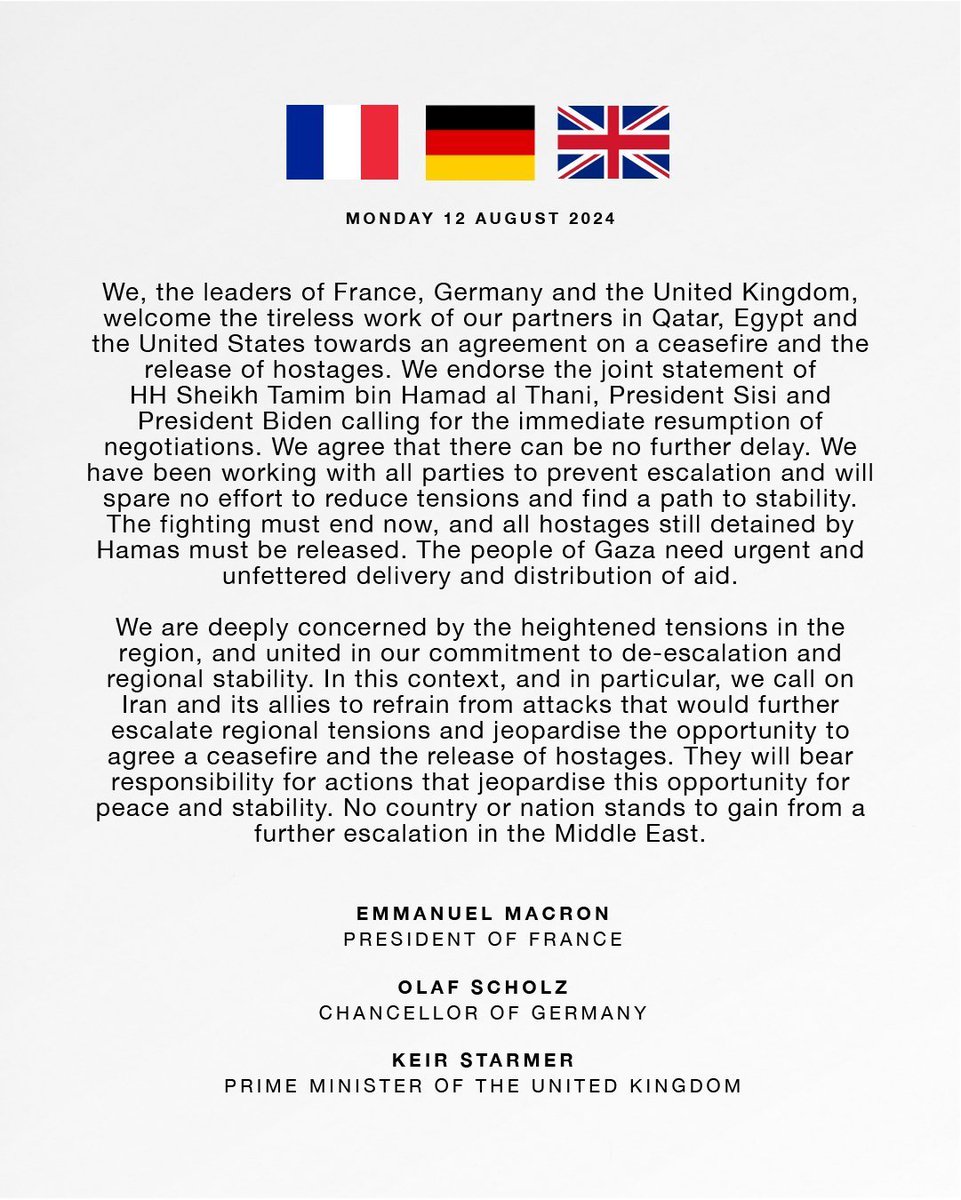 突发新闻:法国、德国和英国领导人发表联合声明:战斗必须立即结束,必须释放所有仍被哈马斯拘押的人质! https://t.co/MVX9Kunfgc