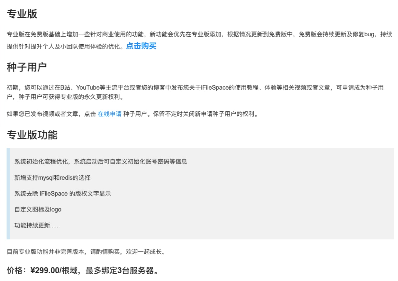 ***"专业版在免费版基础上增加一些针对商业使用的功能"***, 感觉继 Cloudreve 之后又有套娃网盘们可以用的程序了🌚.