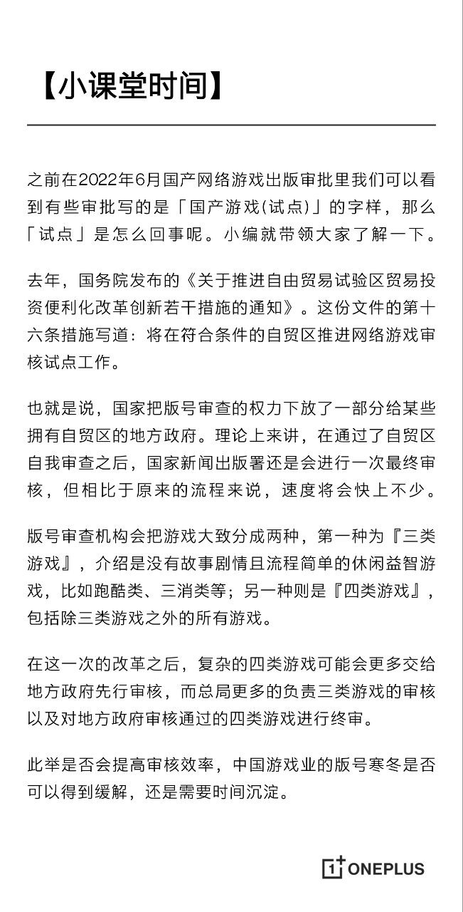 也就是说,国家把版号审查的权力下放了一部分给某些拥有自贸区的地方政府。理论上来讲,在通过了自贸区自我审查之后,国家新闻出版署还是会进行一次最终审核,但相比于原来的流程来说,速度将会快上不少。版号审查机构会把游戏大致分成两种,第一种为『三类游戏』,介绍是没有故事剧情且流程简单的休闲益智游戏,比如跑酷类、三消类等;另一种则是『四类游戏』,包括除三类游戏之外的所有游戏。