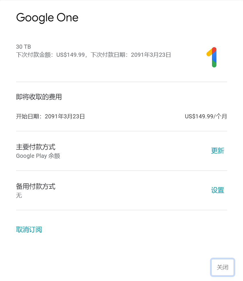 小号的 Google One 30T 已被自动取消.