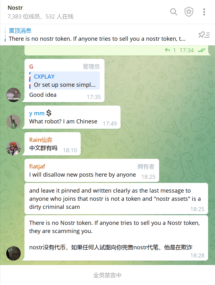 Nosrt 的官方 Telegram 群组好像被币圈诈骗份子盯上了, 刚刚进了全体禁言模式.