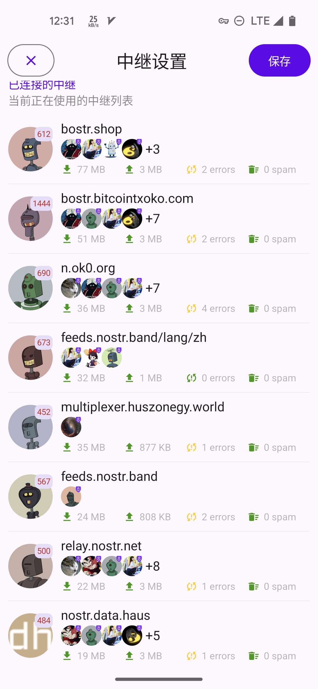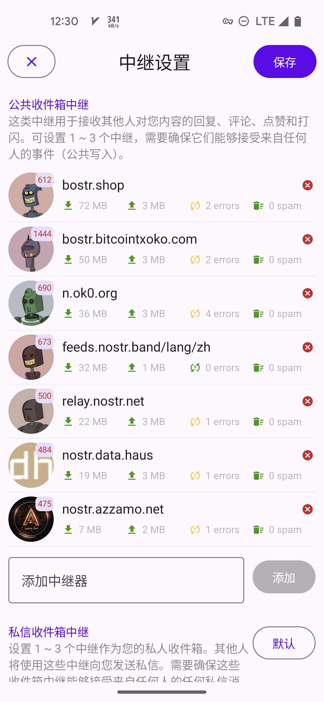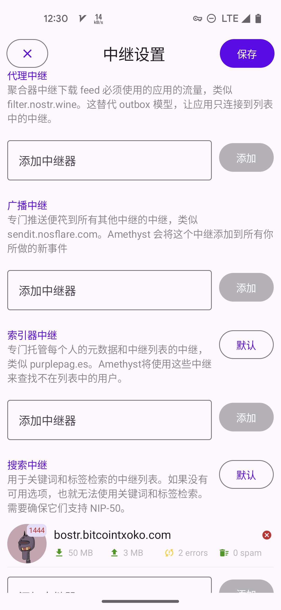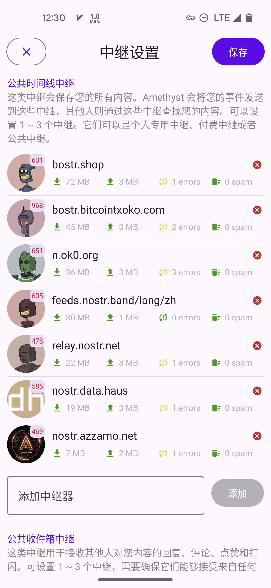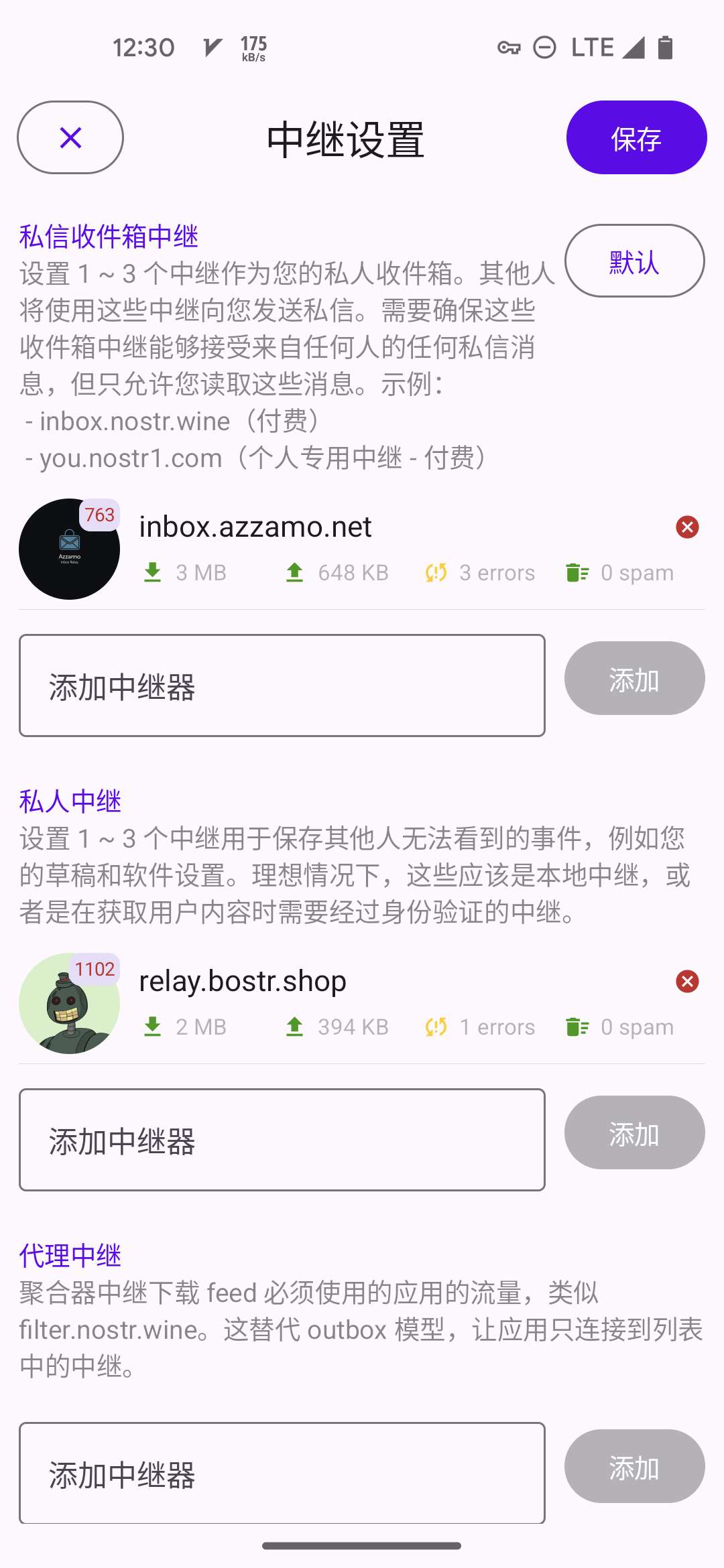 5. 代理中继: 可选. 比如 Bostr 这类聚合了多个中继的中继, 这里专门用来读. 如果设置了, Amethyst 就不会完全用信箱模型, 而是优先从你的这个代理中继列表里面查消息.