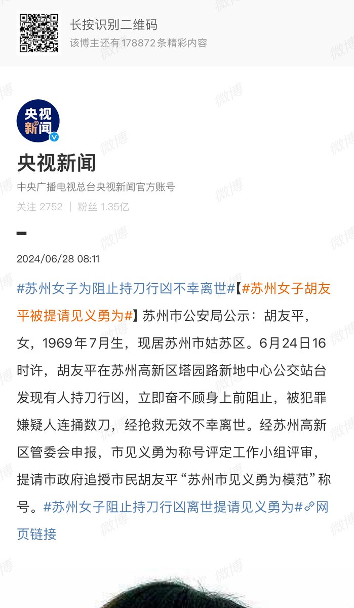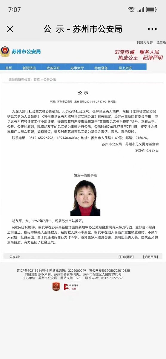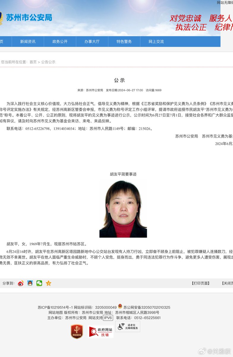 日本驻华大使馆:惊闻胡友平女士经抢救无效不幸离世,我馆深感痛惜。胡友平女士以一己之力从歹徒手中保护了无辜的妇幼,相信她的勇气与善良也代表了广大中国民众。我们在此向胡女士的大义之举致敬,愿胡女士安息🙏