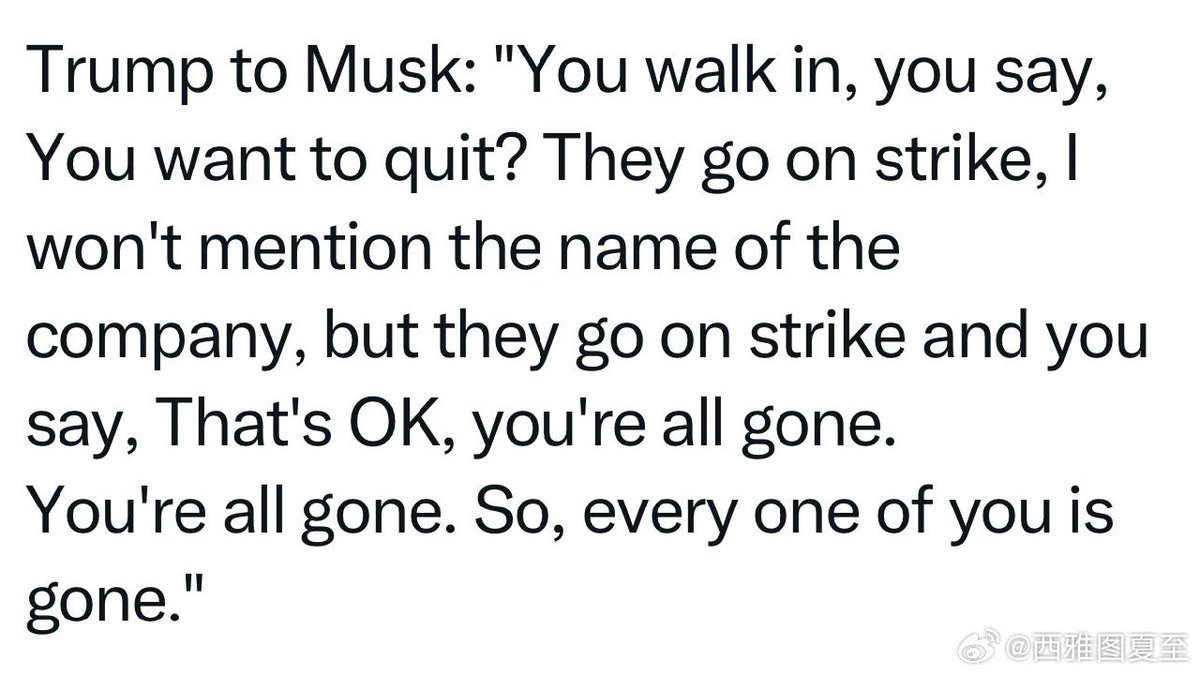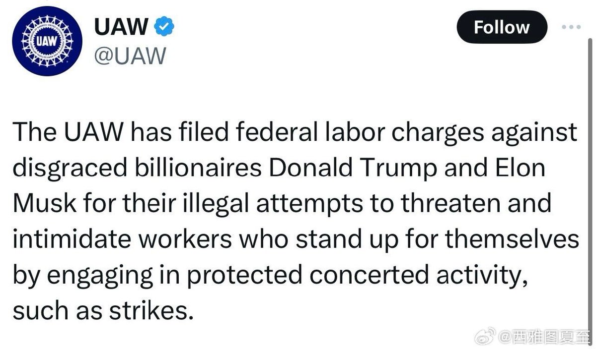 Trump在社媒接受Musk“采访”,宣扬“罢工的都该被开除”,Musk赞同。工会立刻向联邦机构正式申诉:罢工权受法律保护,Trump和Musk威胁恐吓罢工者违法。