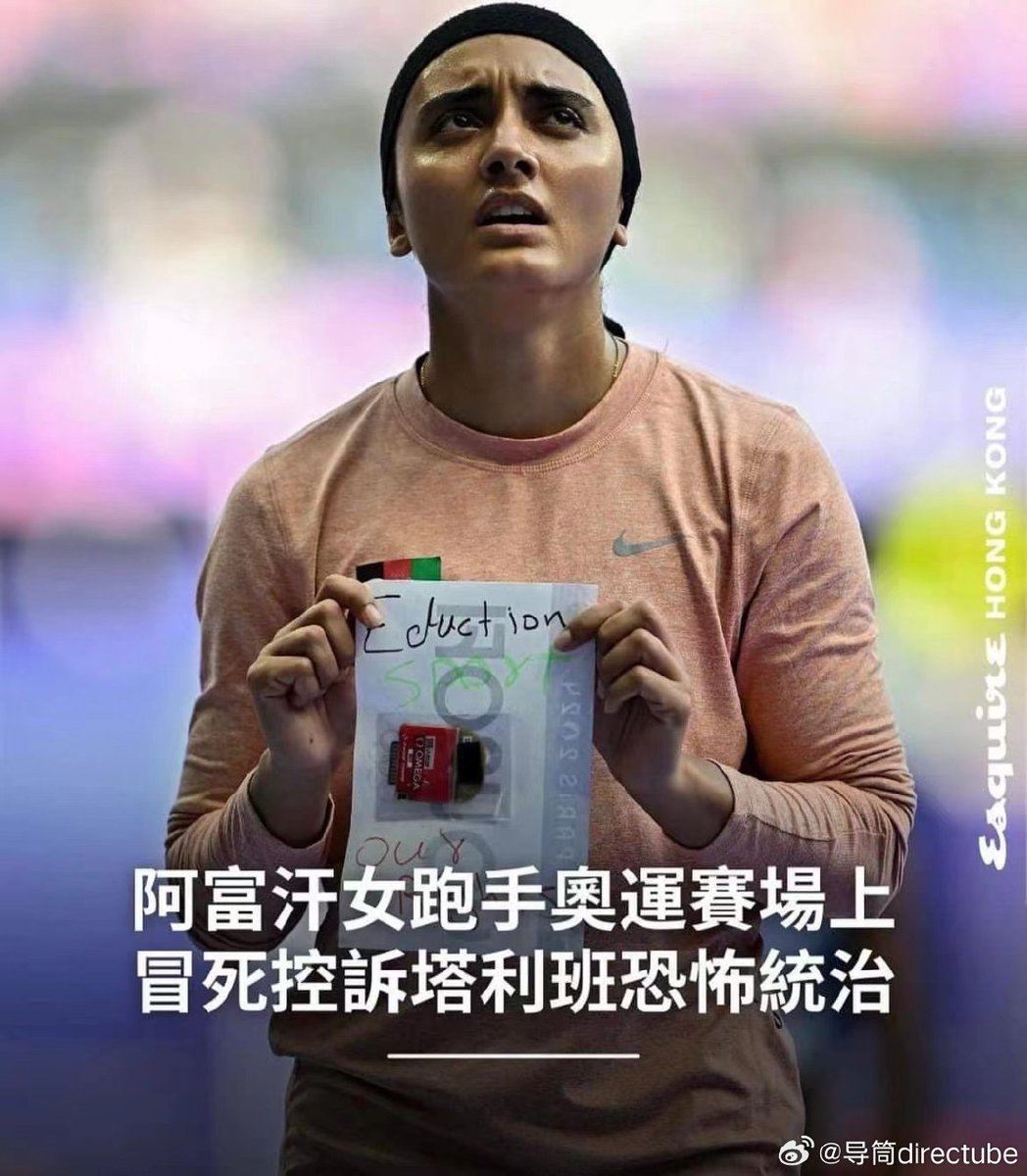 巴黎奥运会女子100米短跑赛后,阿富汗运动员基米亚·尤索菲在世界面前展示了她号码牌背后的标语:“教育,运动,我们的权利。”