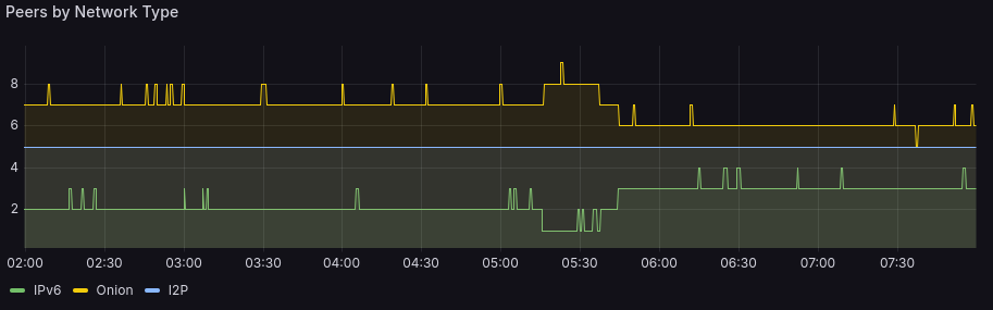 I've been making a custom graphana dashboard and prometheus exporter for my node. This chart is network connection sorted by type. Ipv6, tor and i2p. Need to add ipv4