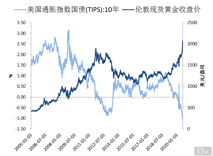 据统计,黄金价格走势与美国实际利率走势呈高度负相关性,10年期TIPS收益率(即剔除通胀影响、可视为反应实际利率的国债)与黄金价格的相关系数为-0.89。