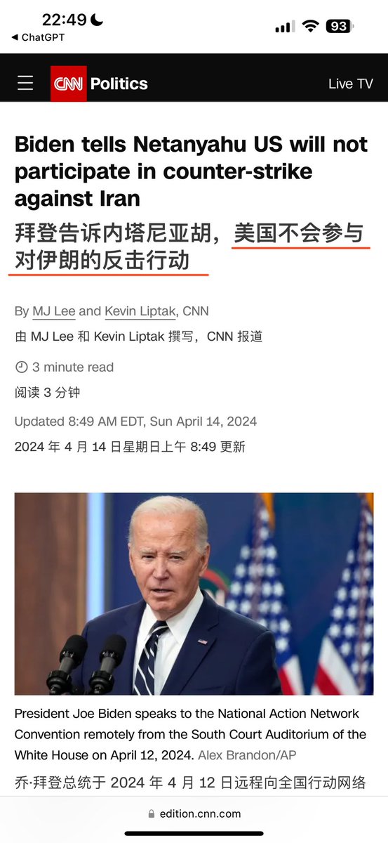 “自周六伊朗发动袭击以来,三位战时内阁成员每天都举行会议,誓言做出回应,但对时间、规模和地点却含糊其辞。他们面临的一个挑战是,如何在设计应对措施时兼顾威慑伊朗、避免地区战争以及不疏远参与击退伊朗袭击的美国和阿拉伯国家等目标。拜登已敦促以色列在采取任何应对措施时谨慎行事,并排除了美国参与以色列对伊朗领土发动袭击的可能性。”—华尔街日报