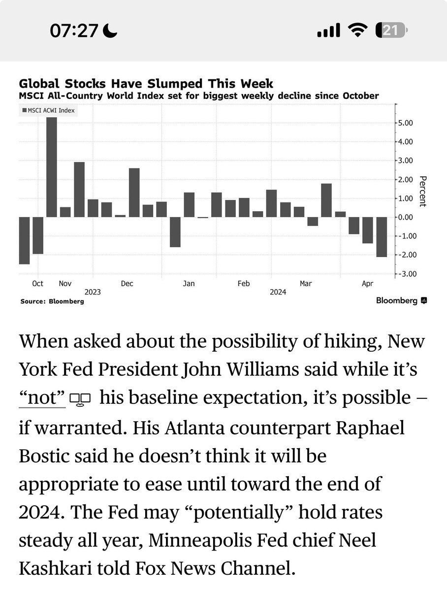 当被问及加息可能性时,纽约联储行长约翰·威廉姆斯表示,虽然这不是他的基本预期,但如果有必要,这是可能的。他的亚特兰大同行拉斐尔·博斯蒂克表示,他认为到 2024 年底之前放松政策将不合适。明尼阿波利斯联储主席尼尔·卡什卡里告诉福克斯新闻频道,美联储可能会在全年保持利率稳定。