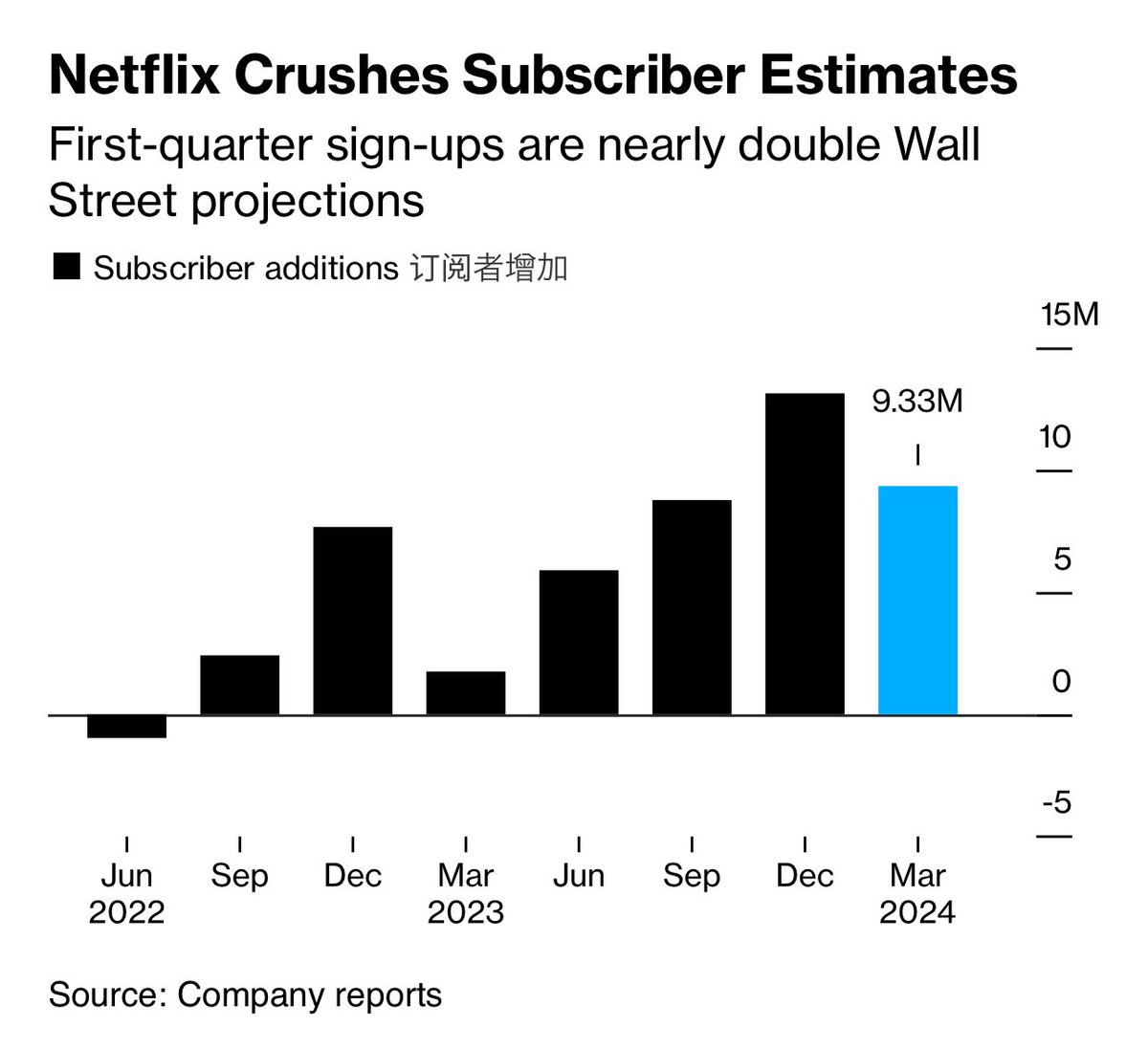 奈飞一季度新用户大超预期,该公司在 2024 年第一季度新增了 933万名用户,几乎是分析师预测的 484万名客户的两倍。Netflix 吸引了来自世界各地的新客户,尤其在美国和加拿大表现出了强劲的增长势头。