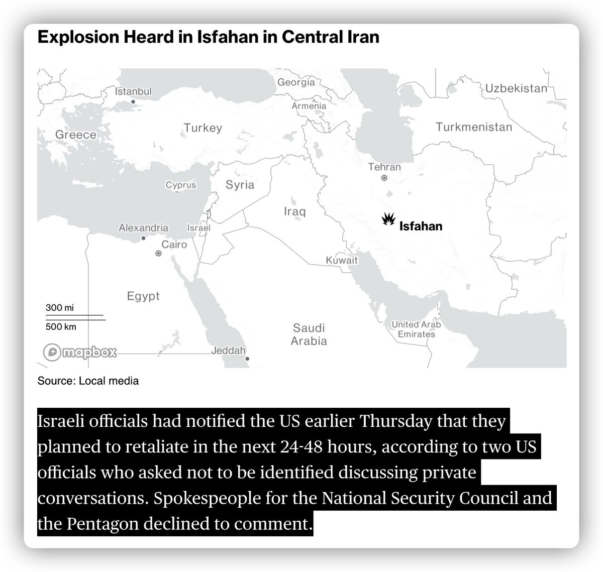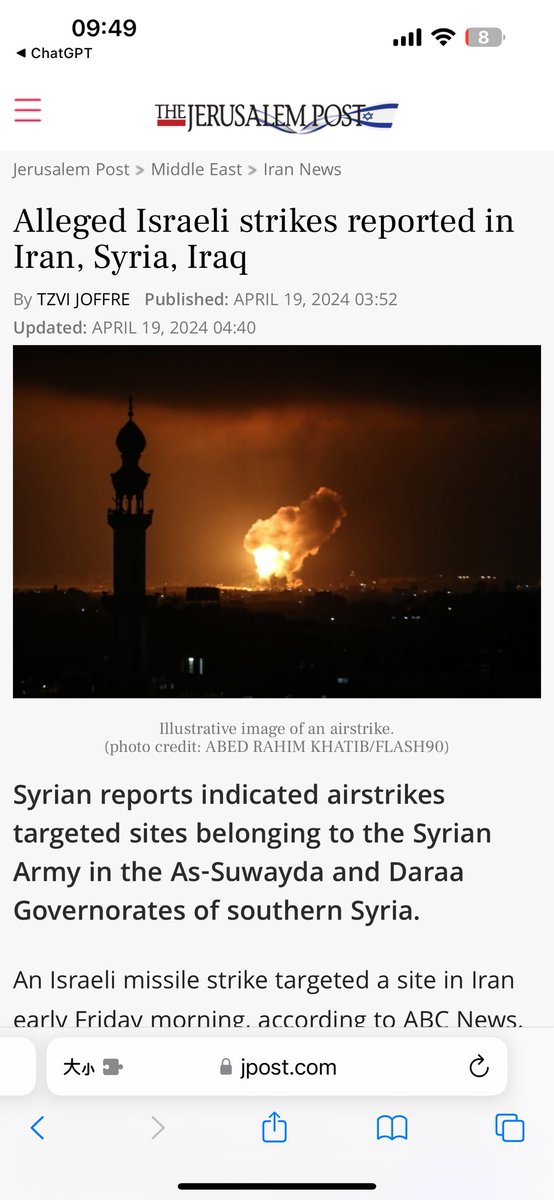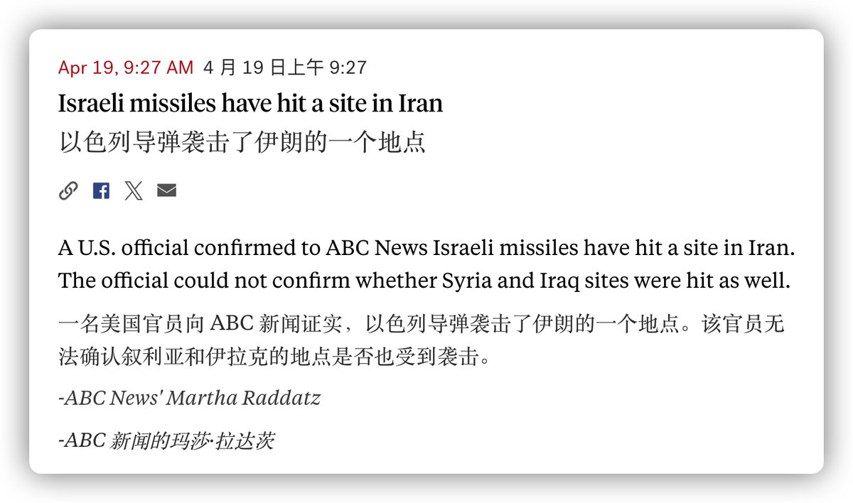 目前的“情报”看,伊朗官方似乎选择了想要小事化了的态度,就跟上周末以色列的态度一样,宣称:“没事没事,没什么大碍” 双方各出一口恶气,然后扯平了。如果是这样,对资本市场是好事。