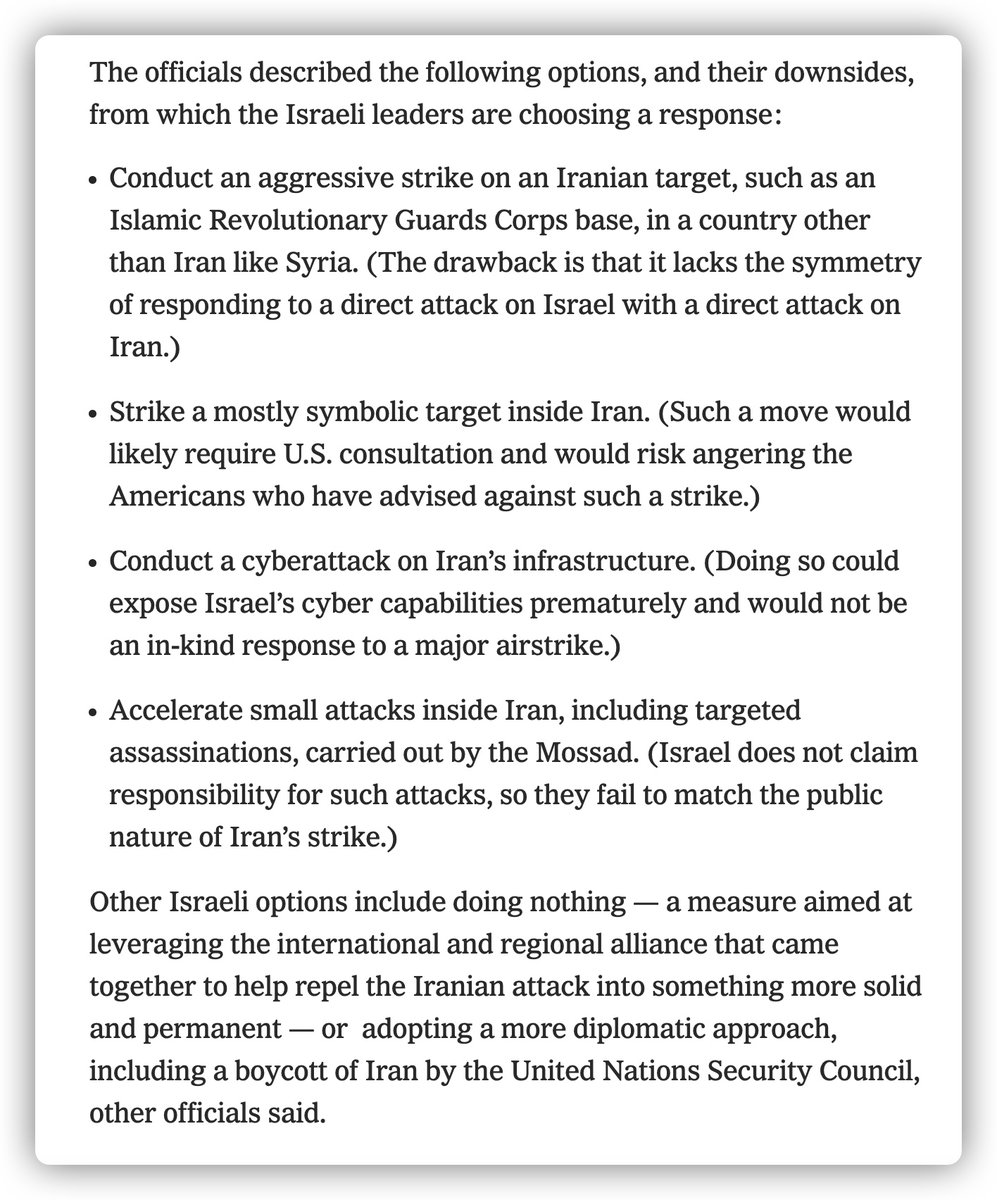 前两天,纽约时报罗列了以色列战时内阁辩论的几个可能报复方案,目前来看以色列应该是选择了第二种。