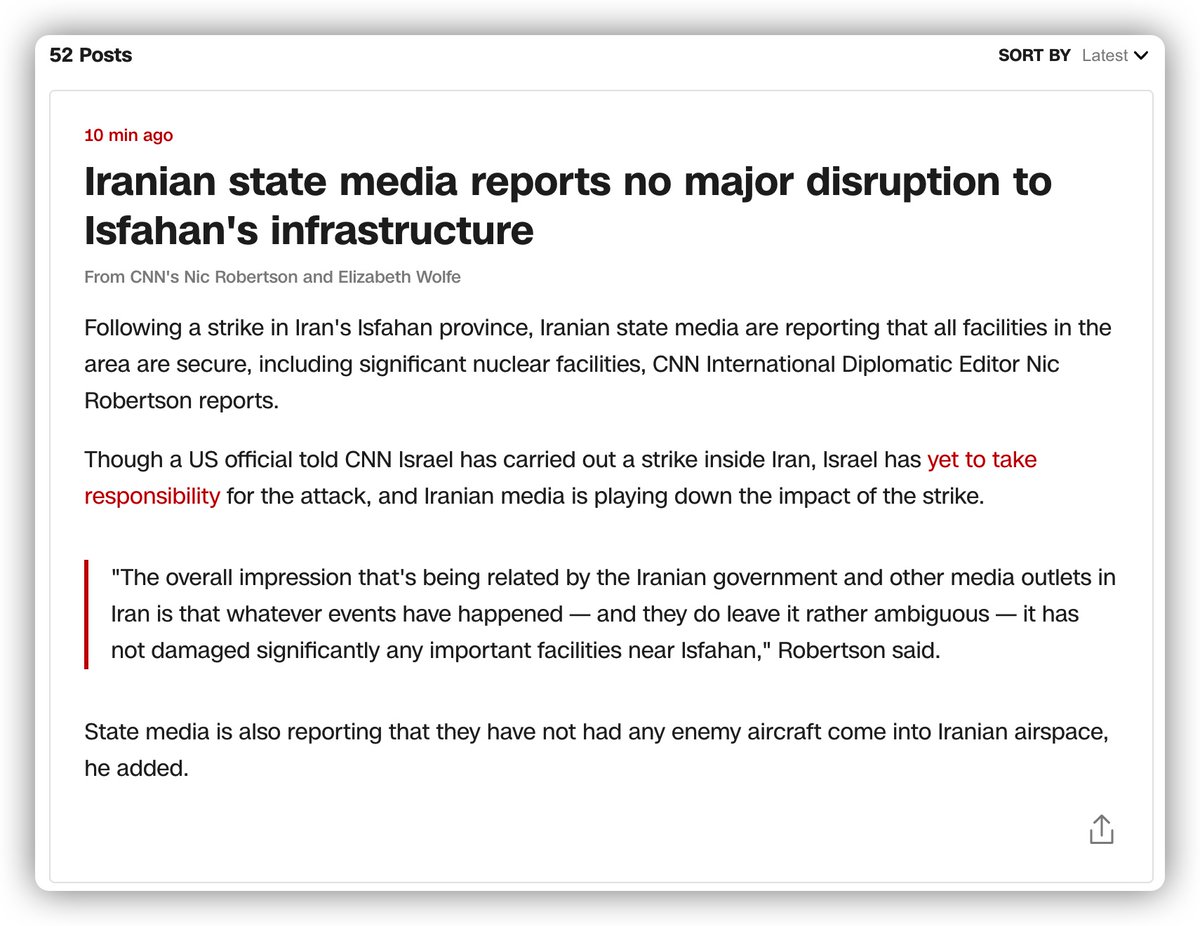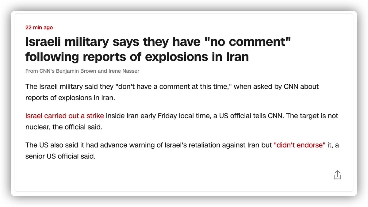 尽管一位美国官员告诉 CNN,以色列已在伊朗境内进行了袭击,但以色列尚未对此次袭击负责,并且伊朗媒体对袭击的影响进行了淡化报道。