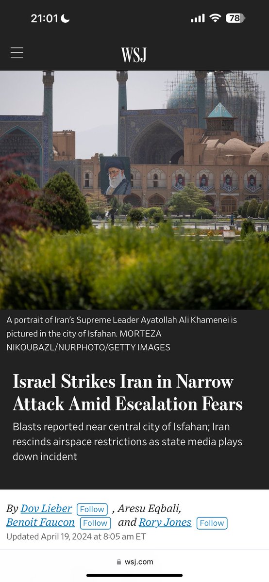华尔街日报把近期以色列与伊朗的冲突包括今天上午的定性讲的清清楚楚。
