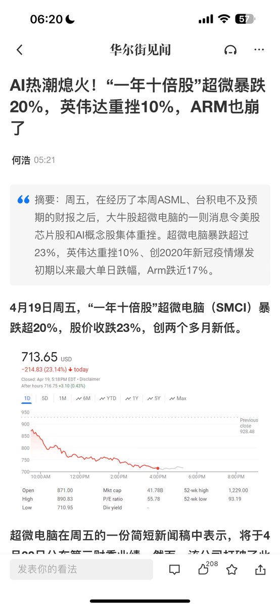 昨晚超微电脑在一份简短新闻稿中表示,将于4月30日公布第三财季业绩。打破了此前提供初步业绩的惯例,引发投资者担心,疯狂减持该股,市场普遍认为,超微公司没有给出积极的预先声明,这被认为是负面的。