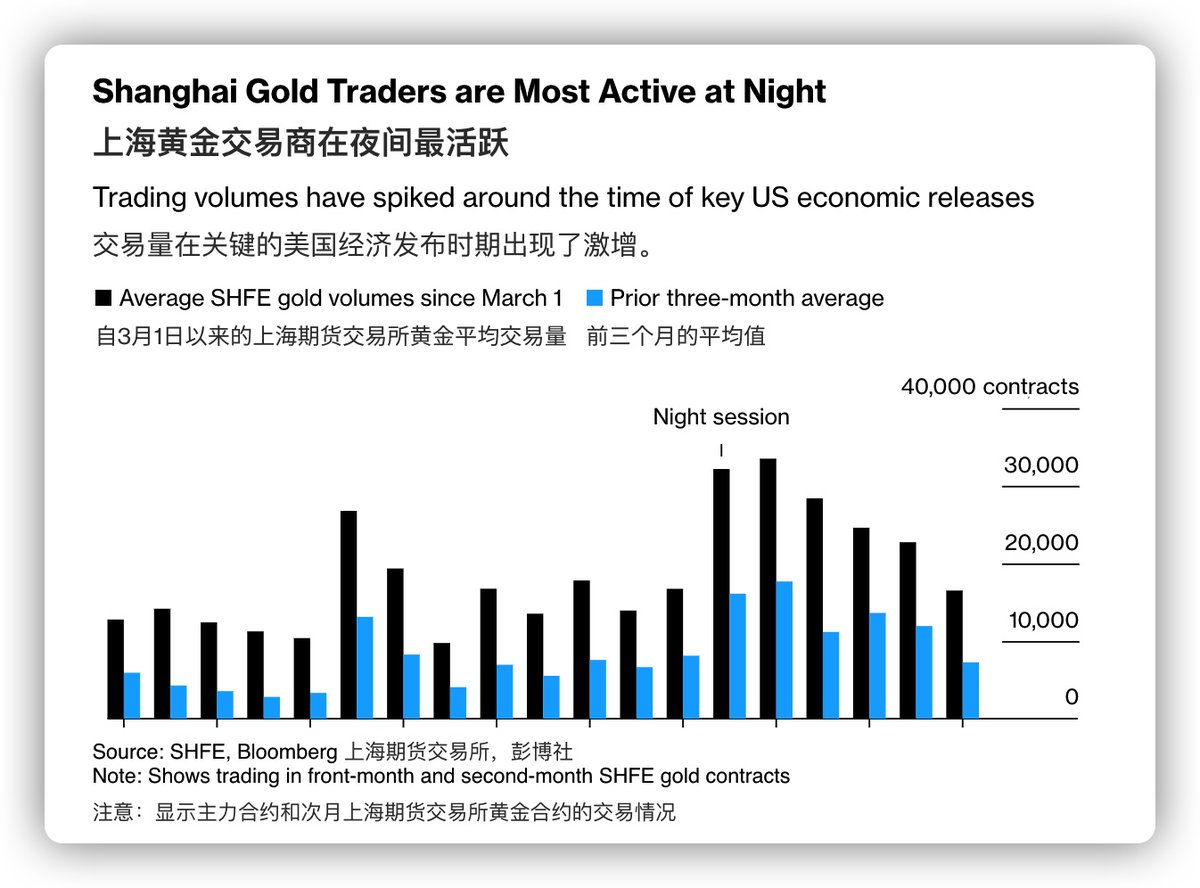 有意思。根据彭博社的分析,上海商品期货交易所的黄金交易最活跃的时段居然是在纽约时段。