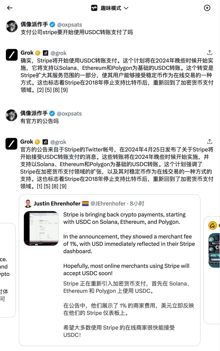 一个值得大家知道的信息,在2024年4月25日发布了关于Stripe将开始接受USDC转账支付的消息。这些转账将在2024年晚些时候开始实施,并支持以Solana、Ethereum和Polygon为基础的USDC转账。 https://t.co/UKoTP0a9xF