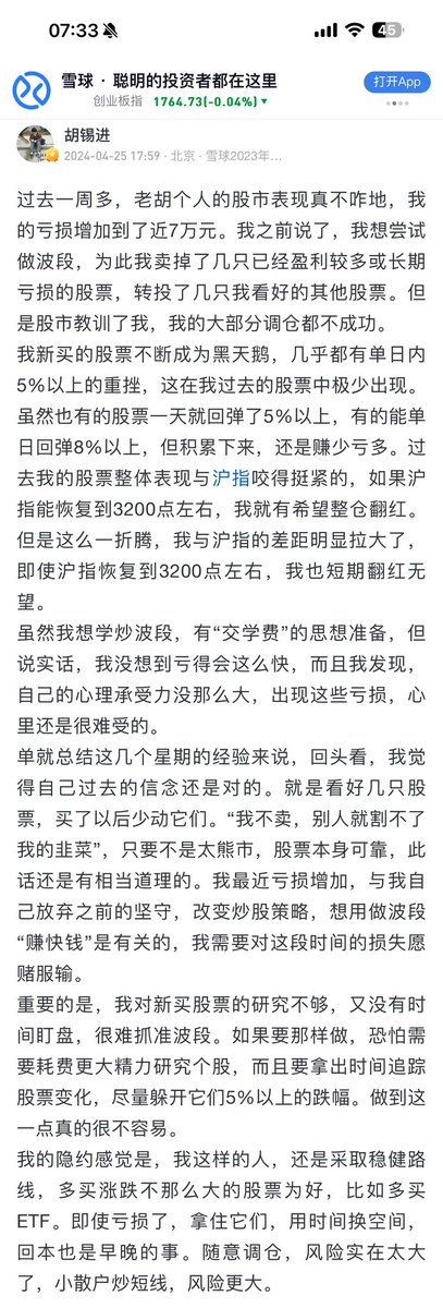 4月12日的时候老胡就说:“看来炒股长期持有几只股票是不行的”,“看来对每只股票都要做波段管理,它低的时候买进来,高的时候卖出去。” 不行我先笑会儿哈哈哈哈哈哈