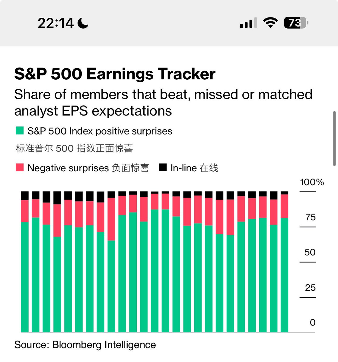 根据彭博智能编译的数据显示,大约有 230 家标普 500 指数公司已经发布了业绩报告,其中约 81%的公司实现了超出预期的业绩。