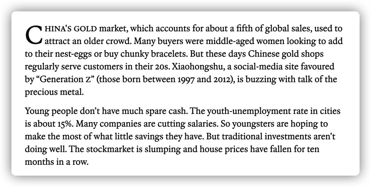 但是现在,中国的黄金店经常为 20 多岁的顾客提供服务,而且她们会剧集在小红书上讨论自己的买金经验。
