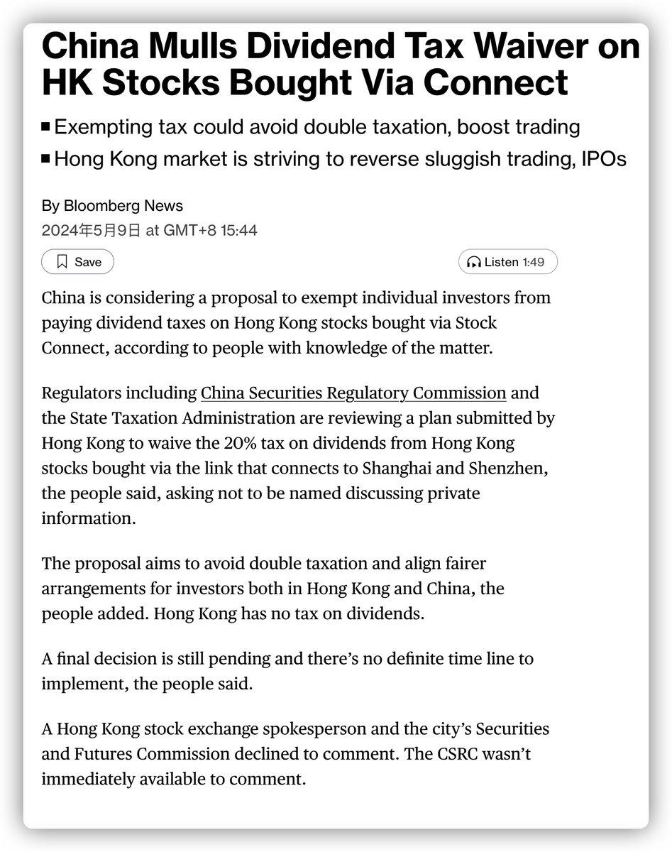 彭博社:包括中国证监会和国家税务总局在内的监管机构正在审查香港提交的计划,免除陆港通购买香港股票的 20%税费。 https://t.co/Iipr5d7dBW