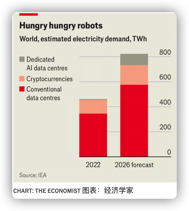 而这主要是在那一年 11 月 ChatGPT 引发了人工智能革命之前。随后产生的轰动导致国际能源署(IEA)这一官方预测机构预测,数据中心(包括专门用于人工智能和同样耗能的加密货币的数据中心)将在 2026 年全球消耗超过 800 太瓦时的电力,是 2022 年的两倍多(见图表)。