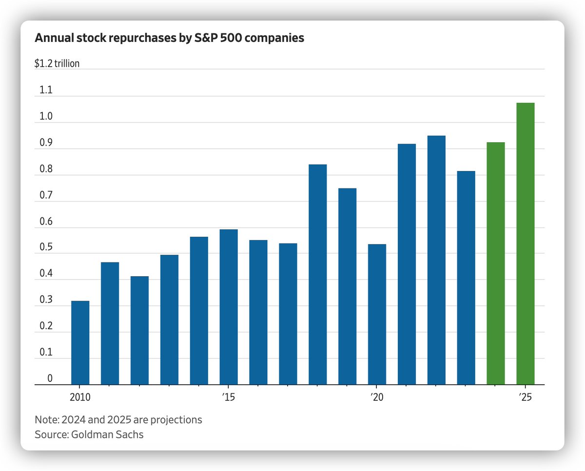 高盛分析师预测,今年标普 500 指数的回购总额将达到 9250 亿美元,到 2025 年将达到 1.075 万亿美元,分别标志着 13%和 16%的年增长率。 https://t.co/hFEgk1Uacv