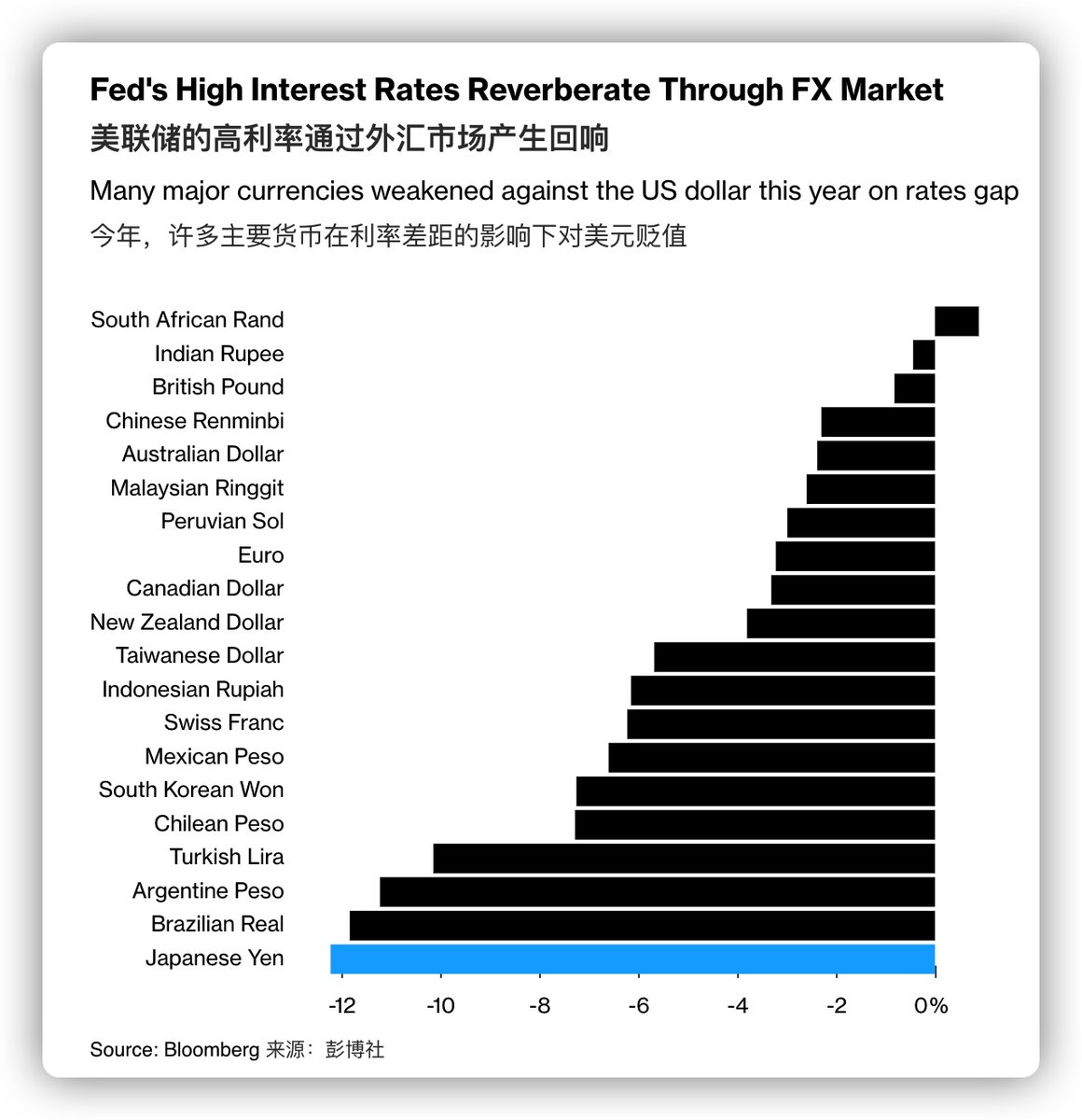 看一下美联储维持高利率下,全球其它国家的货币如何招架?跌最惨的是日元。