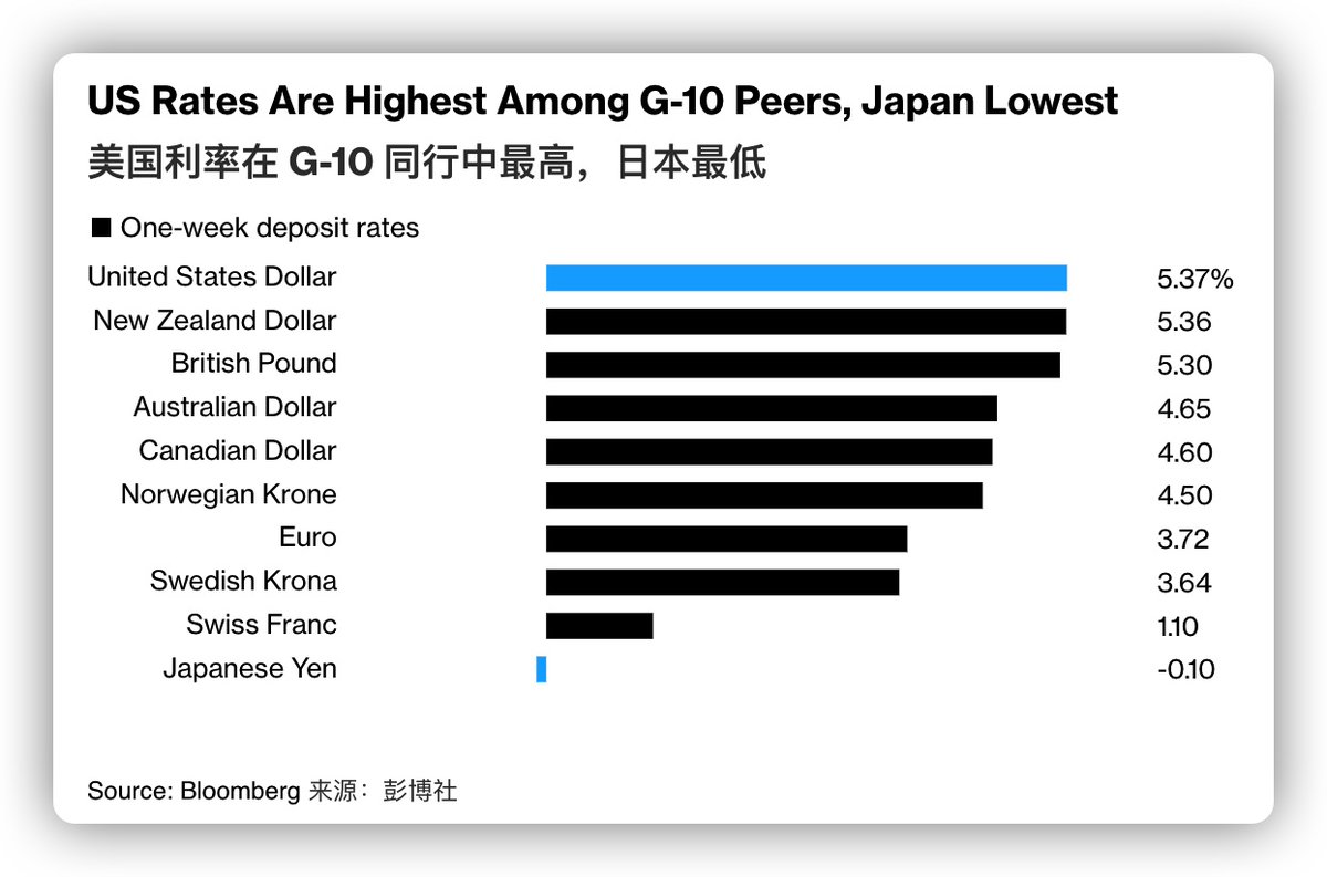 在G10的国家里面,当前利率最高的事美元,最低的是日元。存在巨大的利差。 https://t.co/YbPJU2Ax2O