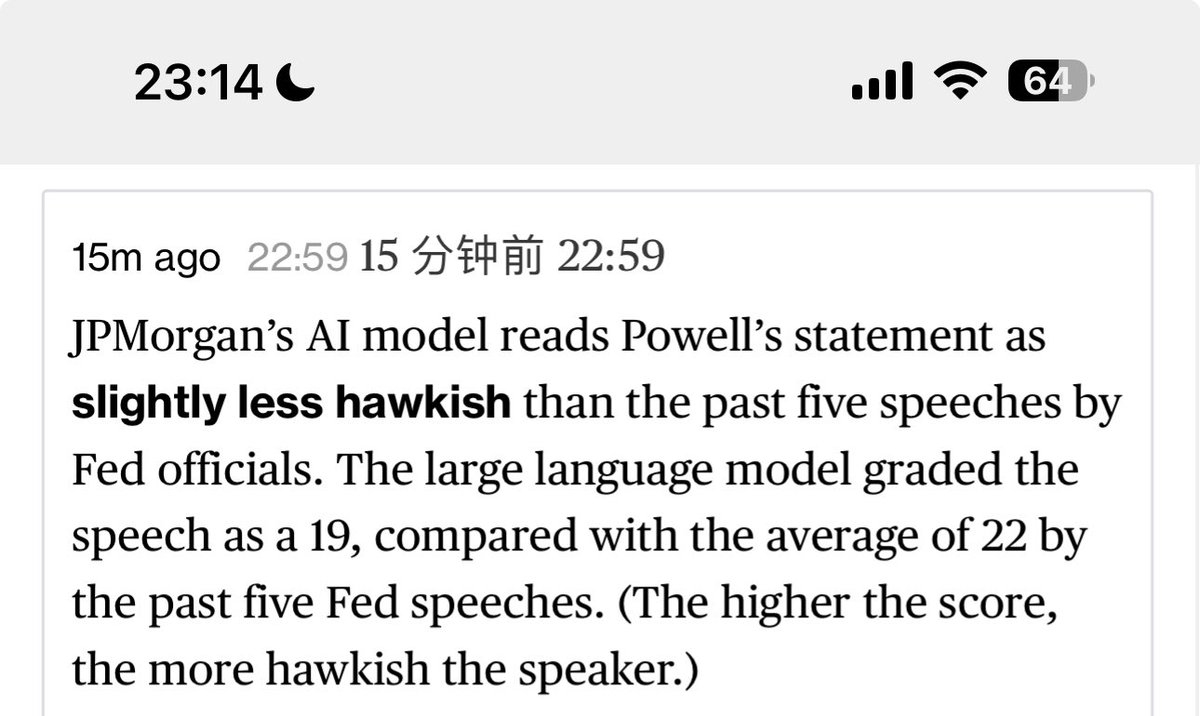 摩根大通的人工智能模型认为鲍威尔的讲话比过去五位美联储官员的讲话略微不那么鹰派。这个大型语言模型将这次讲话评分为 19,而过去五次美联储讲话的平均评分为 22。(评分越高,讲话者越鹰派。)