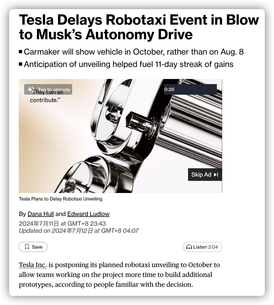 彭博社独家,特斯拉的机器人出租车活动推迟到了10月份,这个消息出来的时间与特斯拉昨晚走势大跌的时间相吻合。 https://t.co/fCV8Bh8pdq