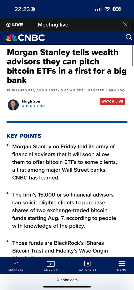 该公司的大约 15,000 名财务顾问可以从 8 月 7 日起向符合条件的客户推销两只比特币现货ETF,消息人士透露。这两只一只是贝莱德的一只是富达的。